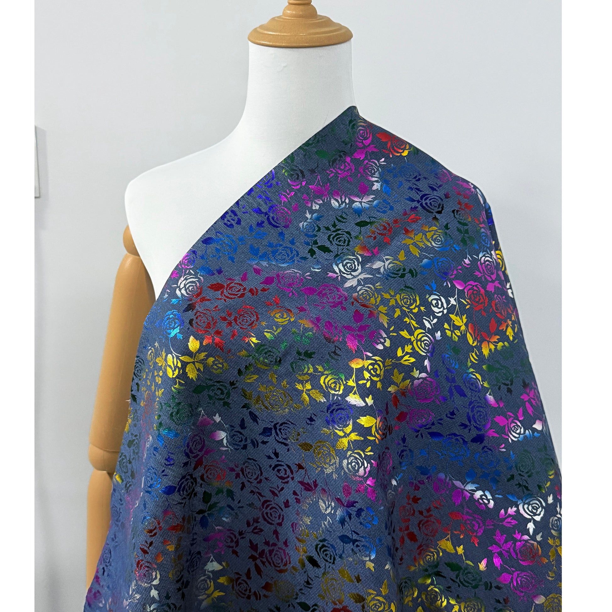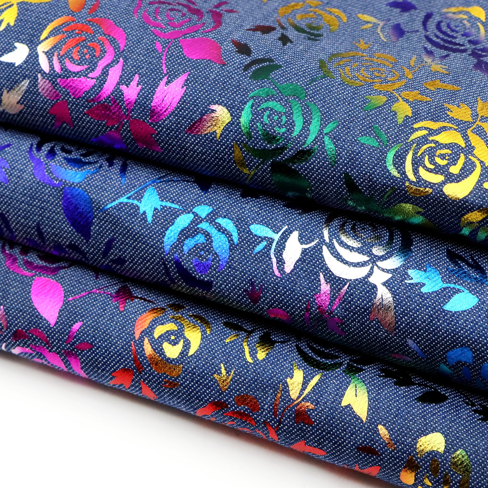 1pc Rainbow Foil Rose Flower Denim Fabric, 59x19.68inch Pre-Cut 100% Polyester, Vibrant Rose Design for DIY Crafts, Bags, Sewing Projects & Hats, Hand Wash Only, Sewing Supplies, Craft Fabric | Vintage Style Fabric | Durable Fabric, Denim Fabric